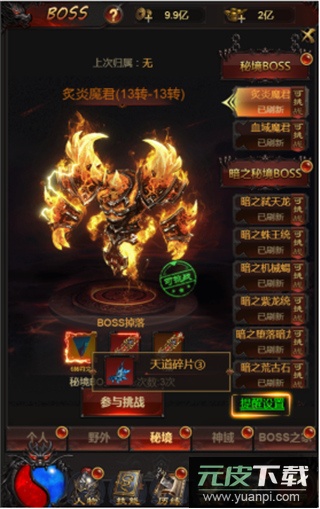 BOSS战分为个人、野外与秘境三类,主要掉落高级装备和稀有道具: