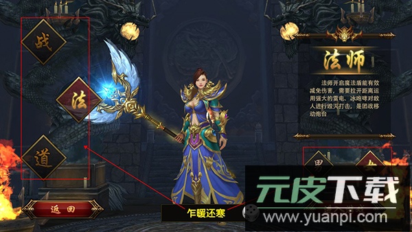 1、打开游戏后进入职业选择界面,从战士、法师、道士中挑选心仪的职业,即可开启冒险;