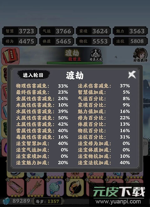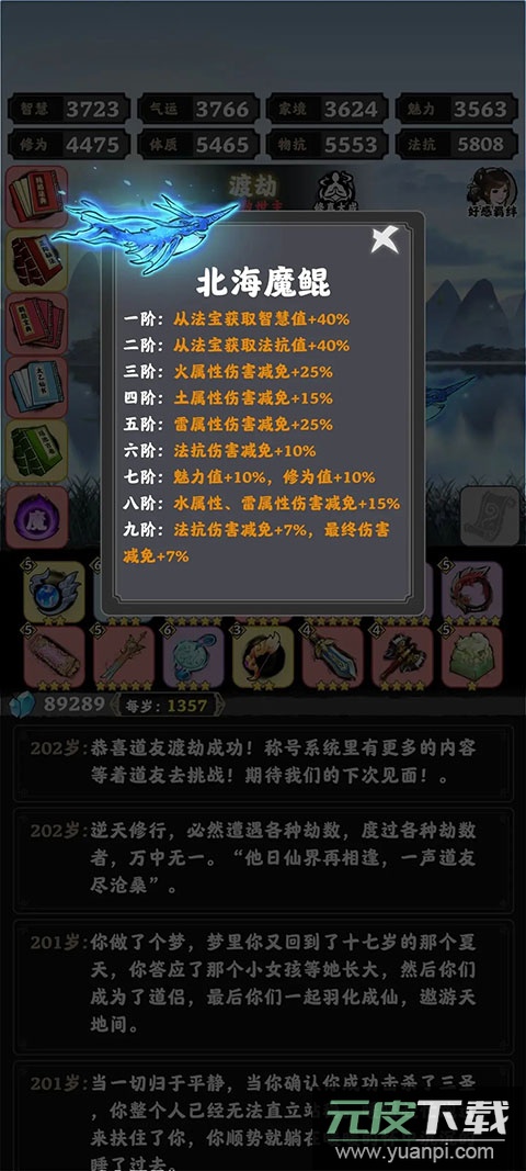 5. 丹药:渡劫时若修为不足,可适当服用修为丹药;丹药应优先提升智慧、气运、家境、魅力这四项基础属性,尽量保持四维均衡;想通关建议四维属性均达到3200以上。