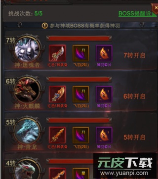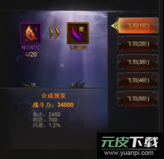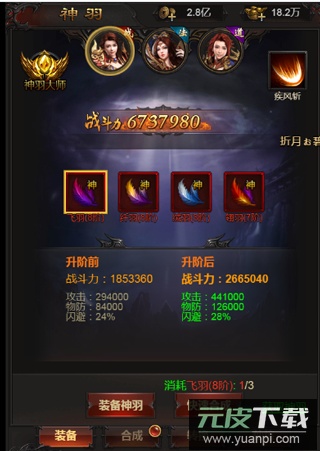 神羽系统:装备神羽可大幅提升战斗力;羽翼等级越高,能装备的神羽品质也越高。集齐整套神羽还可获得额外称号加成并激活神羽技能。