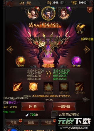 羽翼培养:消耗羽毛或相关道具可升级羽翼,提升属性值;羽翼达到特定等级会激活专属技能,同时解锁更高级的外观效果。