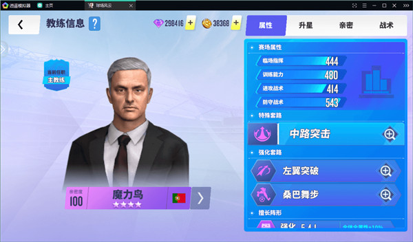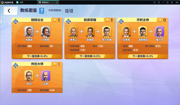 教练系统拥有独立的图鉴,目前共可激活四个,教练升星会同步提升对应图鉴的加成效果。教练支持重生功能,便于玩家优化资源配置。点击任意教练头像,可进入其养成界面,查看属性、战术与擅长阵型。教练最高可升至五星,升星能解锁特定阵型与战术。亲密度则影响教练属性的发挥,满亲密更能提升全队球员属性。各品质教练还可镶嵌对应品质的战术书以大幅增强战力。