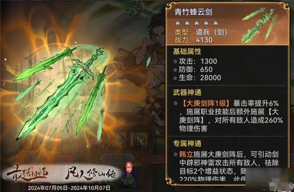 蓝色天命属性:道兵青竹蜂云剑拥有独特技能“辟邪神雷”,普通攻击时可触发此效果,造成显著伤害。