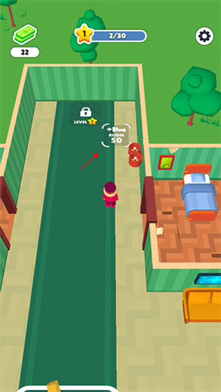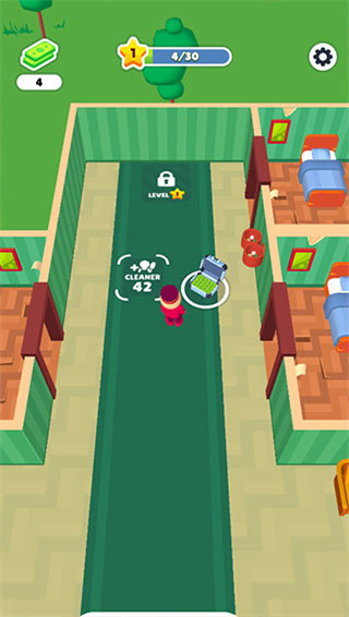 3、给客人安排好对应客房,客人退房后需要及时清理打扫,才能继续接待下一位客人,移动操控的小人靠近待清理区域,就会自动启动清理工作。