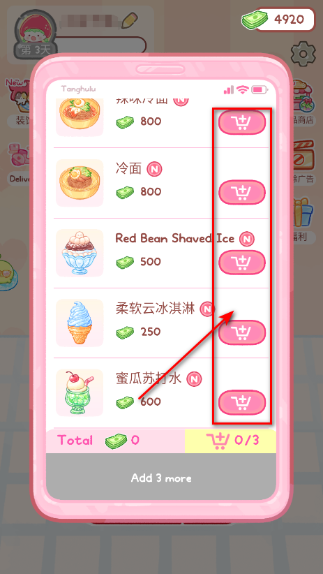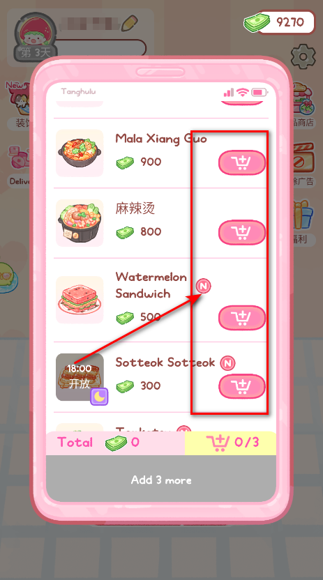 2. 挑选喜欢的食物,点击右侧购物车添加,每次限购三份;
