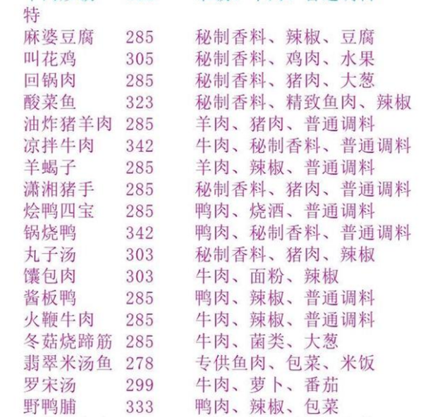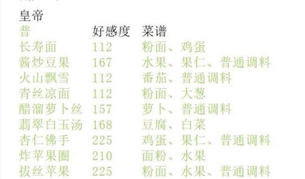 皇帝偏爱的菜谱如下:普级:长寿面、酱炒豆果、火山飘雪、青丝凉面、醋溜萝卜丝、翡翠白玉汤。