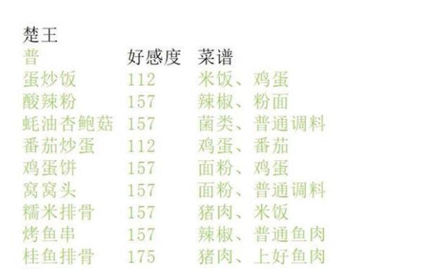 楚王喜爱的菜谱包括:普级:蛋炒饭、酸辣粉、蚝油杏鲍菇、番茄炒蛋、鸡蛋饼、窝窝头、糯米排骨、烤鱼串、桂鱼排骨。