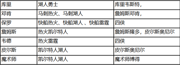 在此阶段,我们确定的优质组合优先级为:凯尔特人+湖人、热火+凯尔特人、热火+雷霆、热火+快船、马刺+热火、马刺+湖人、雷霆+快船、湖人+快船、湖人+勇士。需要说明,当四侠组合中有两人在同一球队,即认为满足条件;詹姆斯与魔术师之间的高额加成构成特殊组合。