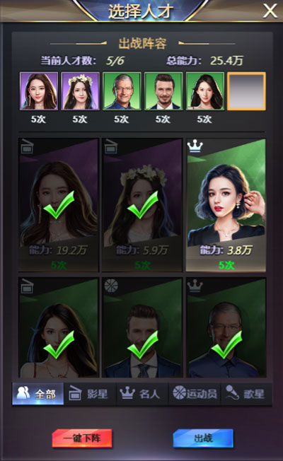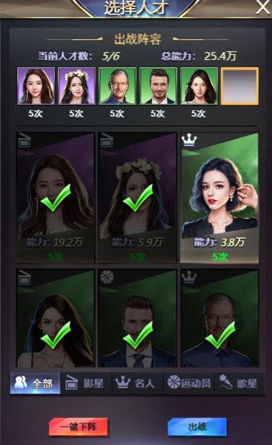 2、出战阵容:每位人才初始拥有5次出战次数,每小时恢复5次,每日上限15次;每次商战最多可派遣6人出战。