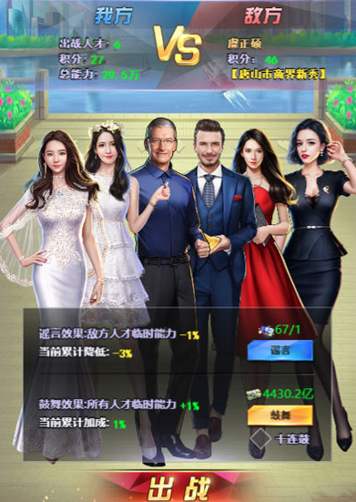 3、商战战斗:选择好出战阵容后,系统根据当前排名匹配对手;战斗前可消耗金钱鼓舞己方人才,临时提升能力,或对敌方使用谣言卡,临时降低对方人才能力。