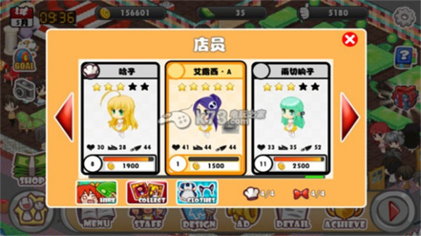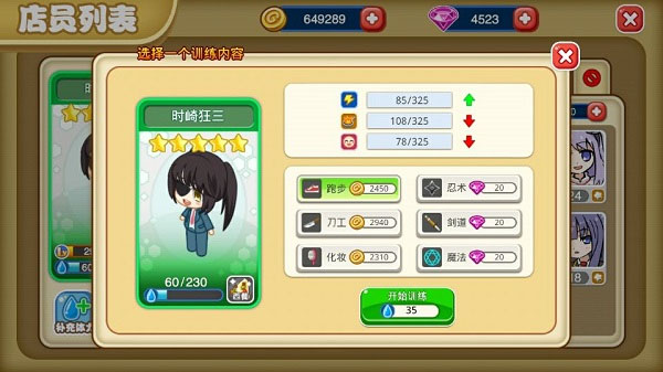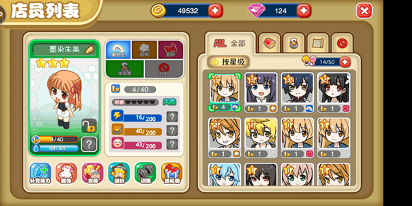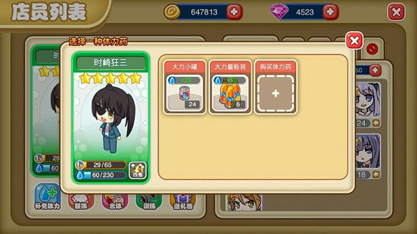 可单独查看每位店员的个人状态,为体力不足的店员补充体力;体力药水可在商店购买。