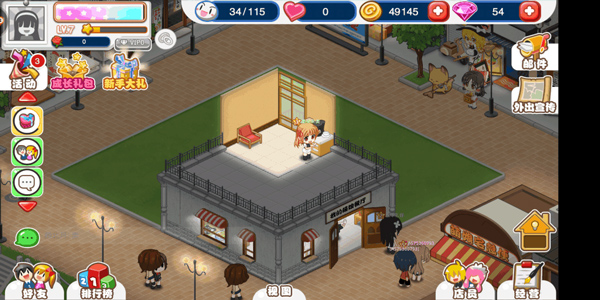 4、宣传时有几率捡到钻石、礼物、体力药等道具,同时回复少量人气值,偶尔还能获得家具;若不想消耗自身体力,也可派遣借来的店员进行宣传,但需要该店员体力上限大于所需消耗值才能成功开始。
