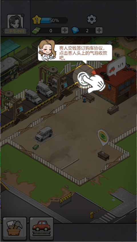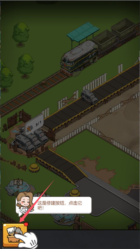 2、点击修建按钮,搭建首个修理车间,用来处理回收的废旧车辆