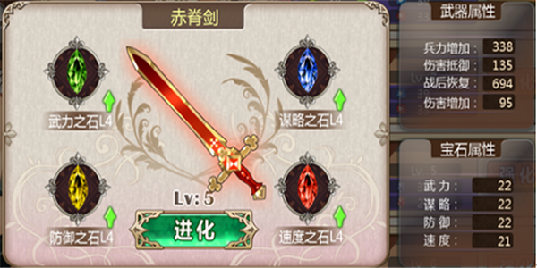 武器镶嵌满四种属性宝石后,就可以进行等级提升;升级后已镶嵌的宝石会全部消耗,武器原有属性不会发生变化,升级完成后可镶嵌对应武器等级的新宝石。
