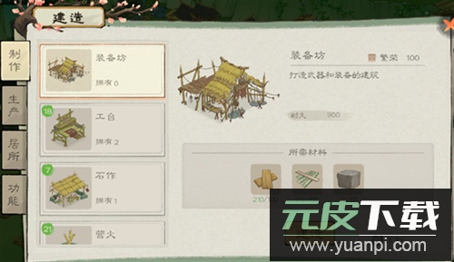 建筑分为制作、居所、生产与功能四大类别,查看界面可了解具体介绍、繁荣度、耐久及所需材料。