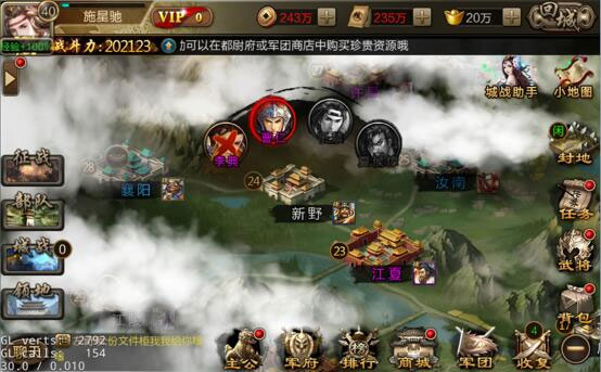 在城池内可以进行酒馆招募、客栈宴请、集市购物、演武竞技、资源购买与战役挑战;在世界地图中则可攻打关卡、参与城战、拜访武将。