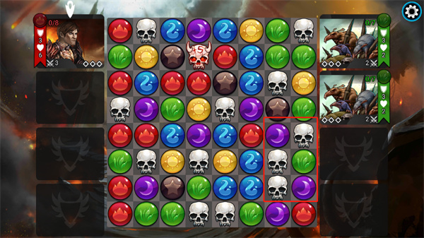 宝石战争手机版是一款融合策略卡牌与消除玩法的游戏。玩家每次消除宝石都是在为卡牌积蓄能量,进而一举击败敌人。游戏中,你将在棋盘上消除多种颜色的宝石;消除剑宝石可直接伤害敌人,消除其他宝石则积累对应卡牌的法术。玩家与敌人在同一棋盘交替行动,率先将对方队伍成员全部击杀即可获胜。
