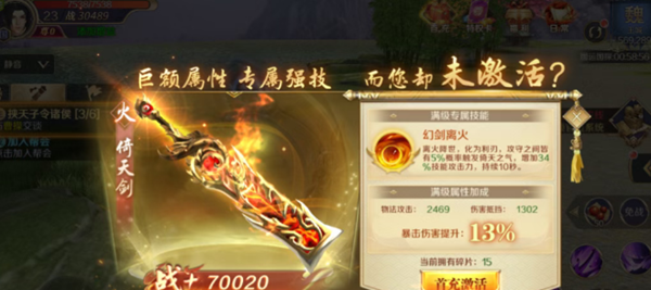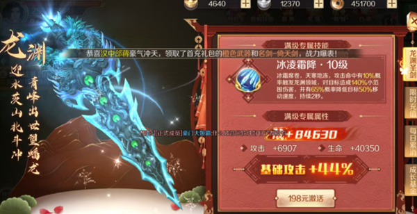 4、龙源剑:通过开服盛典活动充值198元激活;参与国战相关任务会掉落升级材料,使武器能够不断强化。