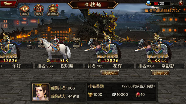 2、挑战时仅可选择与自身名次接近的对手。对于已经击败过的对手,便可使用“挑战五次”功能快速积累声望。