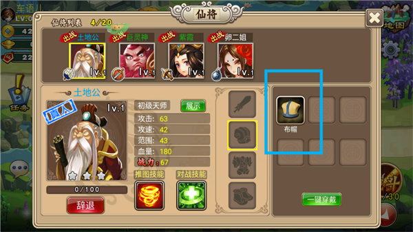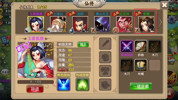 5、在仙将界面中,可以为已拥有的仙将穿戴并强化装备。