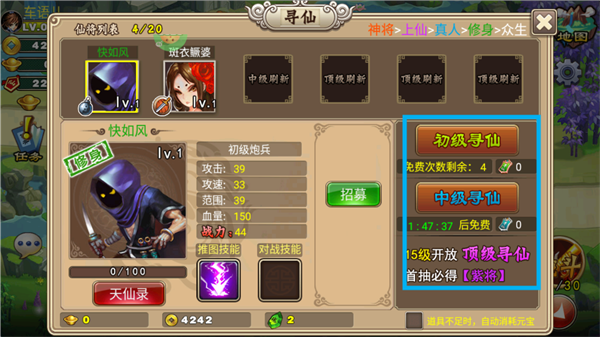 4、点击寻仙功能进行招募,玩家可选择初级、中级等不同层级的招募方式。