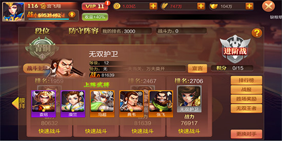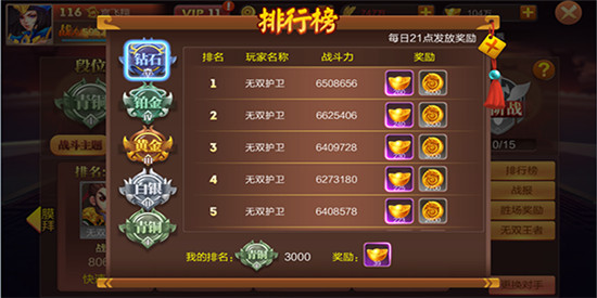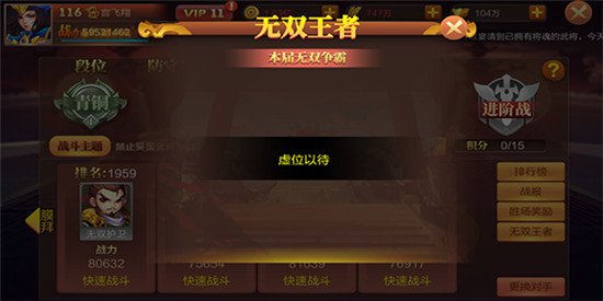 无双争霸每期都有不同的战斗主题,会限制当期可上阵的英雄范围,积分达到指定分数后,就能开启进阶战。 大战国手游0.1折版的无双争霸共设置五个段位,从低到高依次为青铜、白银、黄金、白金、钻石,每日21时会根据玩家当前段位及排名发放对应奖励。