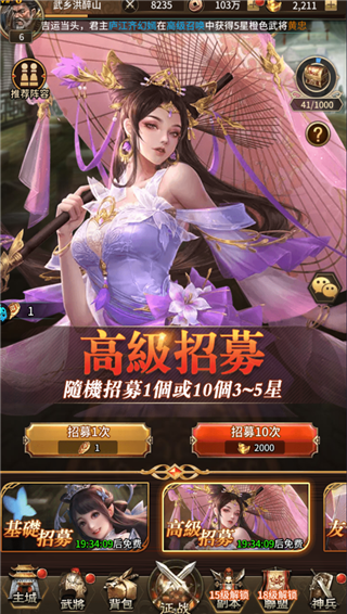 2、前往招募界面抽取武将,前期拥有一名高稀有度的强力武将能大幅降低闯关难度;