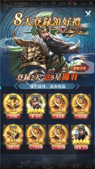 1、下载安装大战国手游后打开登录,首先领取签到礼包,礼包内包含大量稀缺资源;