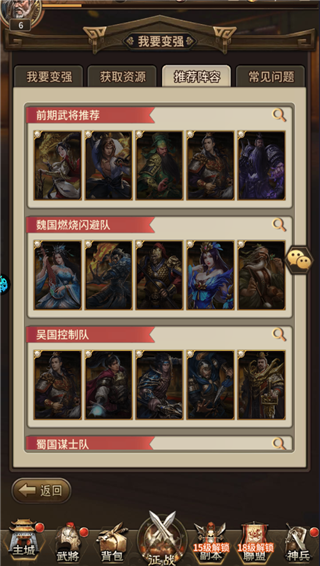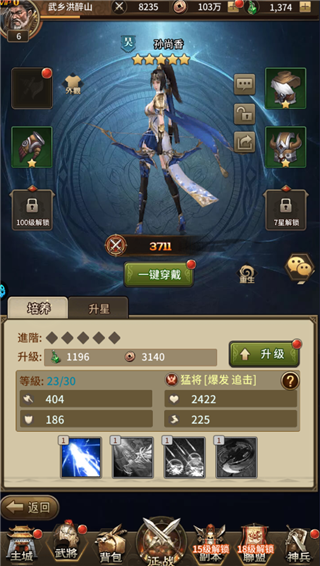 4、进入武将界面,升级武将等级、穿戴并强化对应武器装备;