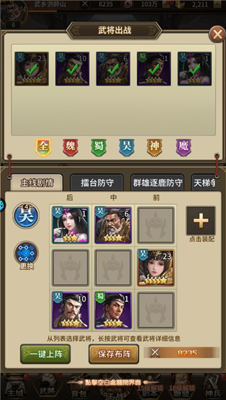 5、点击布阵按钮,可根据不同玩法需求自定义配置对应出战阵容;