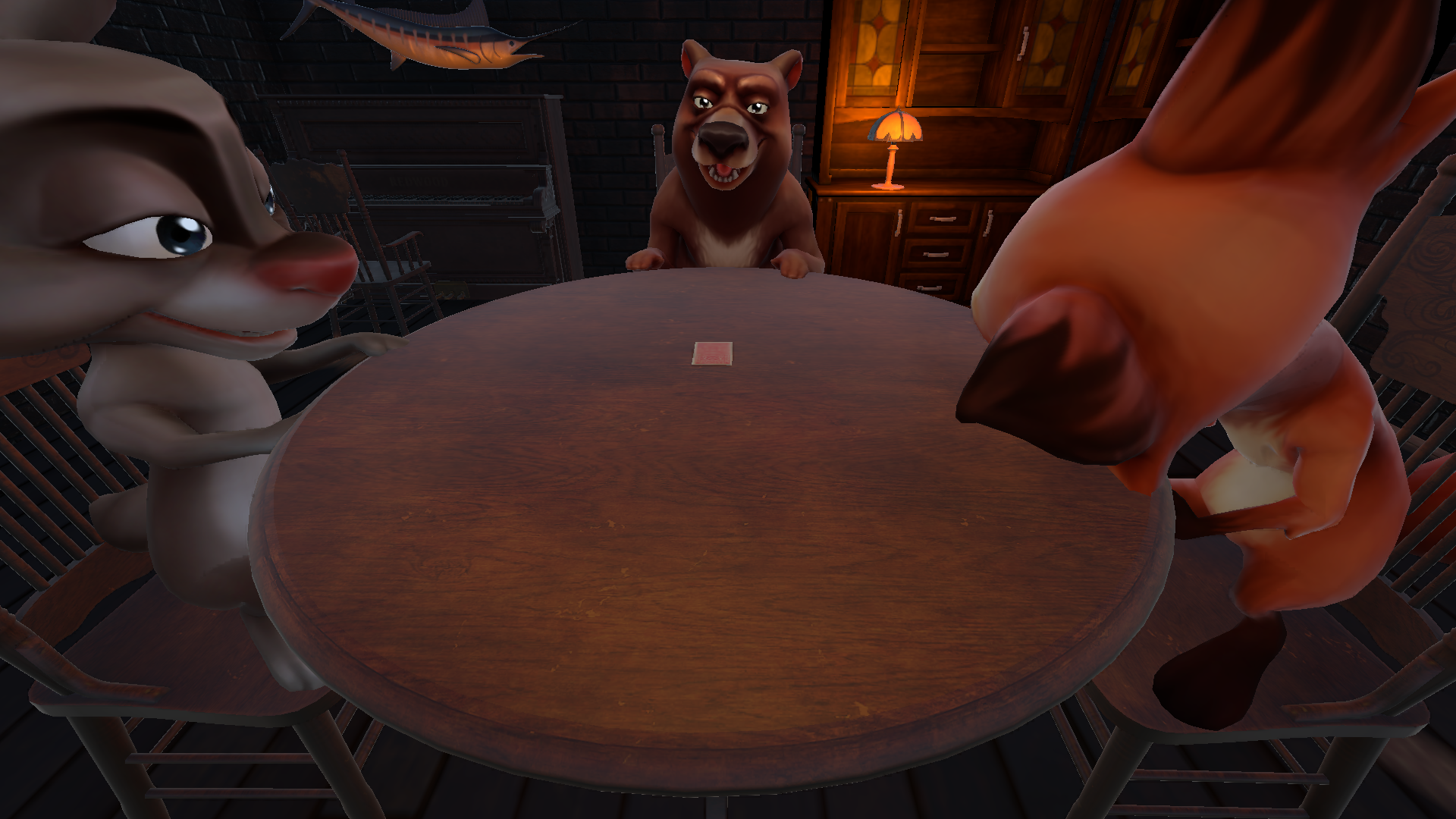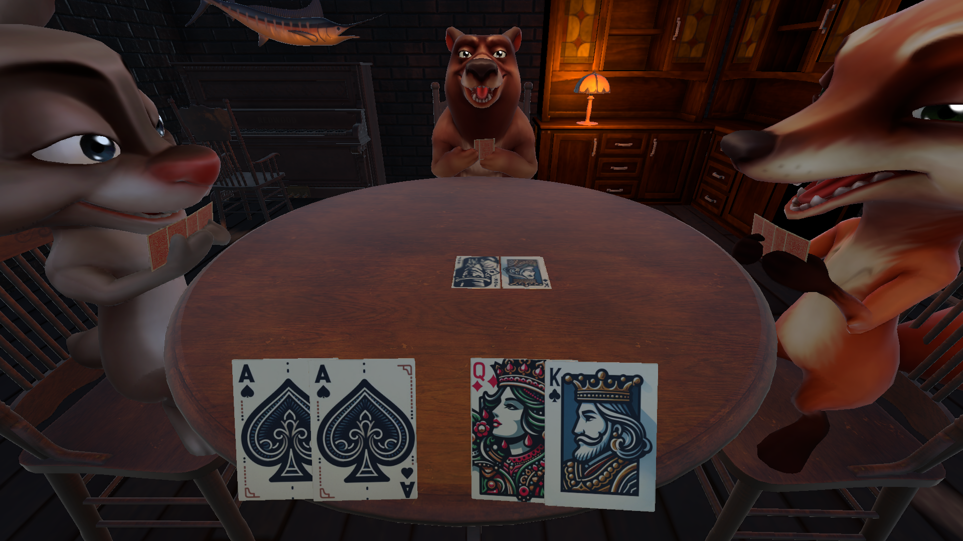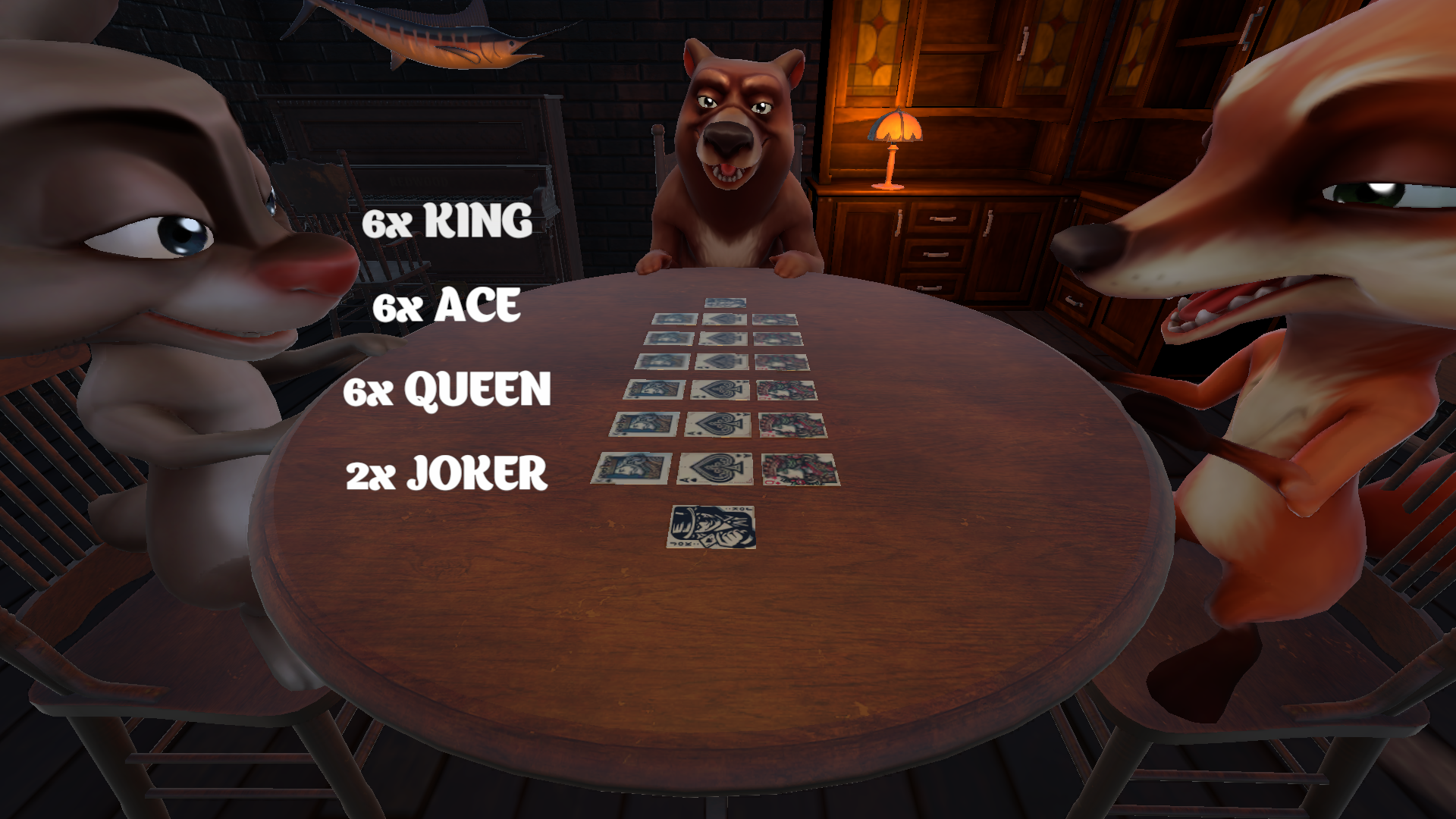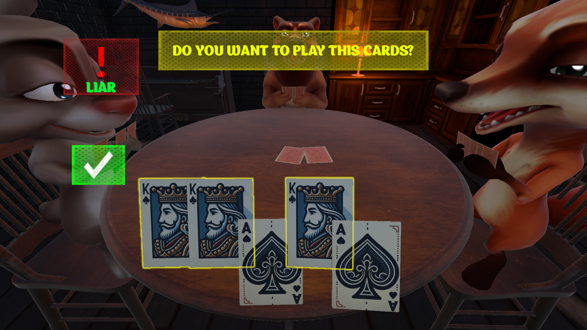游戏设置了扑克牌对局、扔骰子对局两种趣味玩法,扑克牌环节里,玩家需要按轮次出牌同时报出对应牌面数值,过程中可以编造谎言迷惑对手,成功骗过对手就能抢占对局优势,要是谎言被对手识破,就要进入俄罗斯轮盘射击环节,轮盘没触发子弹就进入下一回合,扔骰子对局的规则和扑克环节一致;