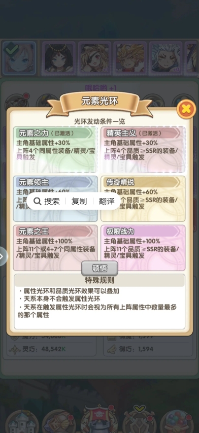 装备、宝具、精灵相关 一共六种元素,分别是地、水、火、风、光、暗; SSR和同元素装备可以激活两种光环效果。