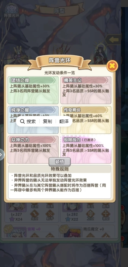 阵营光环目前只能选同阵营五个随从,或者五个SSR随从二选一拿最大加成,暂时还没有五个同阵营SSR随从的搭配方案。