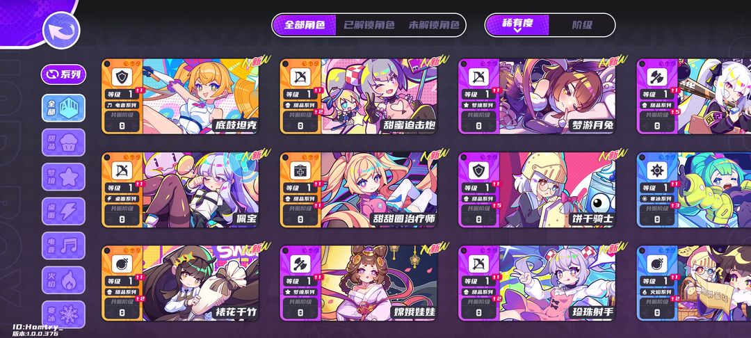 1、游戏内有大量可爱角色,分为六个类别:生产、射手、战士、坦克、辅助、特殊。