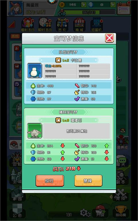 2、狩猎得到的宝可梦属性达标可以直接上阵替换原有宠物,属性偏低的宠物可以直接放归处理;