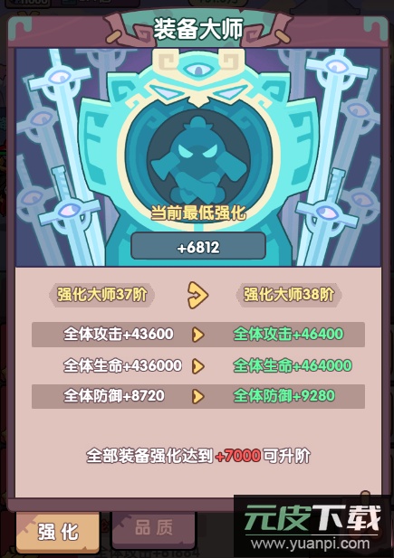 4、当六件装备品质全部达到相同阶位时,能够激活装备品阶大师,为全体单位提供百分比属性加成。