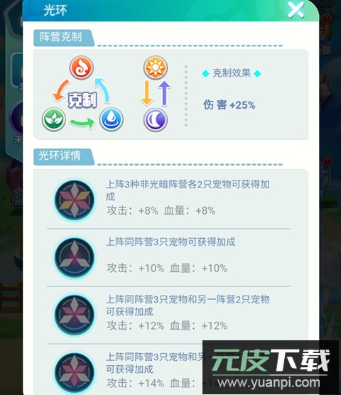 宠物阵营间存在相互克制机制,火、水、自然三系形成循环克制,光明与黑暗则相互克制;同时上阵同阵营宠物可激活额外的光环增益效果。