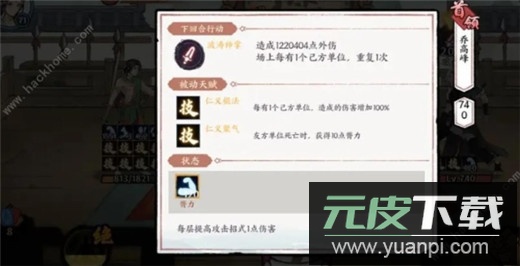 2、乔帮主每两回合攻击一次,每四回合的攻击次数会依据场上存活目标数量增加(若仅剩其一人,则攻击两次);可携带一张白浪连天,保留至第六回合使用,用以格挡帮主的高伤害技能,争取更多输出回合;