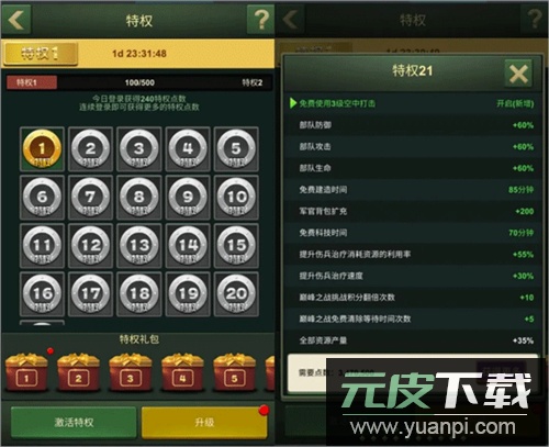 指挥部界面左上角设有“特权”入口;通过成长积累的特权点数可提升特权等级,等级越高,在特权激活状态下获得的各项加成就越显著,这对前期快速发展助力巨大。