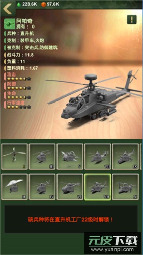 直升机工厂用于训练各类空中单位,随着工厂等级提升,可制造隐形直升机、阿帕奇、鱼鹰炮艇机、多用途直升机及特种攻击机等;直升机能够克制装甲车与火炮,但其弱点在于突击兵与防御建筑。