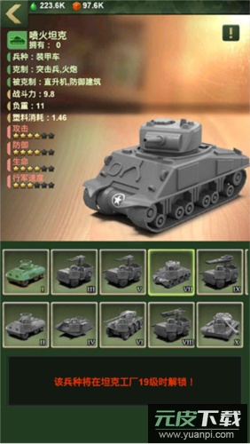 坦克工厂负责训练装甲单位,升级后可解锁中型坦克、防空坦克、冲锋战车、火力支援车及主战坦克等多类型号;该兵种能克制突击兵与火炮,但受直升机与防御建筑的反制。