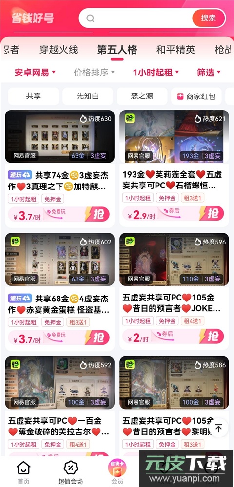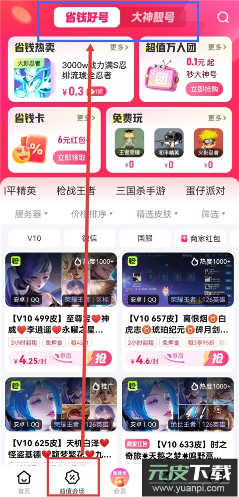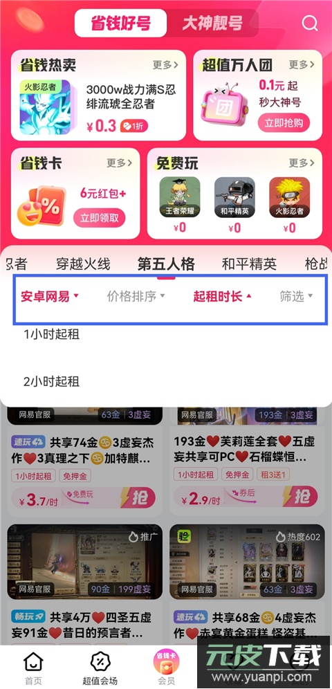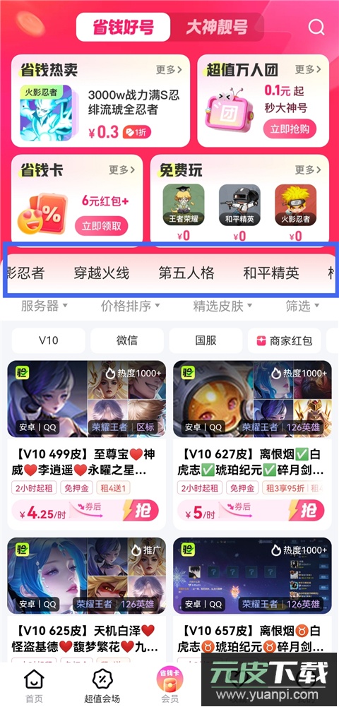 1、打开租号玩专业版app,完成注册登录后进入首页,选择“省钱好号”或“大神靓号”版块,查看可供租赁的账号信息。