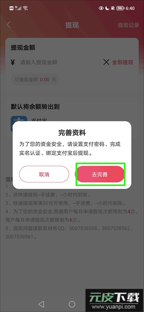 4、由于实名制要求,用户需点击“去完善”选项,依次设置支付密码、完成实名认证并授权绑定支付宝后方可正常使用;