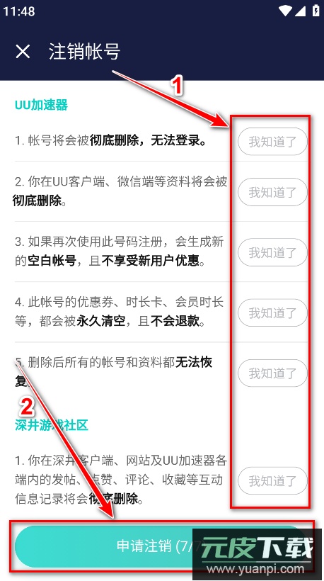 6.依次点击右侧七个“我知道了”,然后点击“申请注销”。